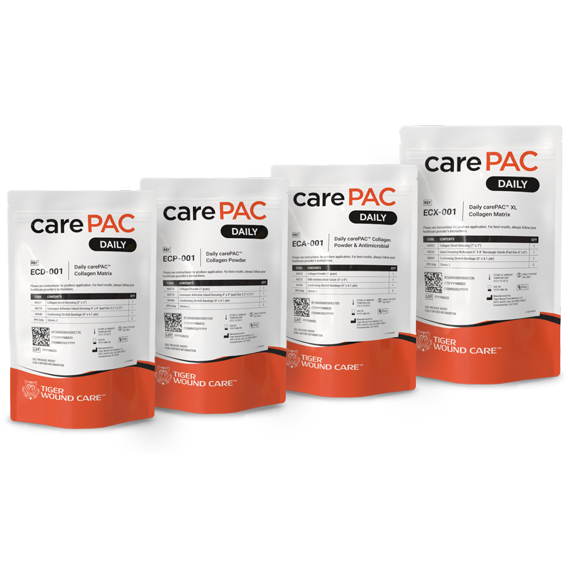 Collagen dressings are 2”x2” sheets of pure collagen intended for direct application to the wound bed. Leveraging this technology, Tiger Wound Care has developed kits containing a primary collagen dressing, as well as a secondary dressing and other required supplies for daily dressing changes.